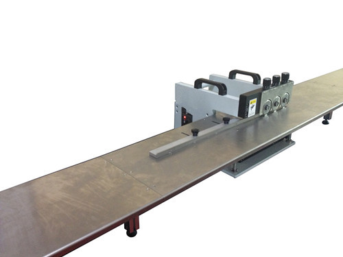2、三刀分板机由三组圆刀片组成,上下两片为一组,构成一个切割单元。分别是A、B、C、三组。整个切割过程分为三个阶段,A 组刀片先切割电路板40%,接着B刀片再次从A刀片切过的槽中碾过,再次完成40% 的切割量,最后由C组刀片切割最后的20% 并修光,由于每次的切割量很小,因此切割过程中产生的应力较传统的一次切断方式减少了80% 以上,分割好的电路板边缘平整光滑,板面非常平整,不扭不翘。是目前市面上唯一的走板式能保证切割后铝板不变形的机器。