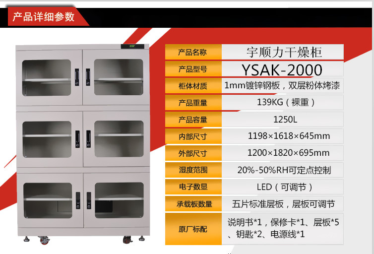 1.宇顺力品牌防潮箱体选用1.2mm优质轧钢钢板制作,钢板硬度高,箱体结构符合设计规范,结格承重性强,整体密封性能优异。