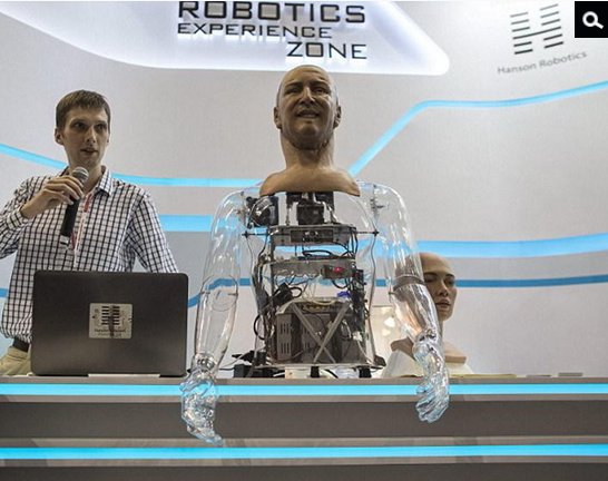 汉森在亚洲国际博览馆举办的全球资源春季电子展上介绍机器人“哈姆”。