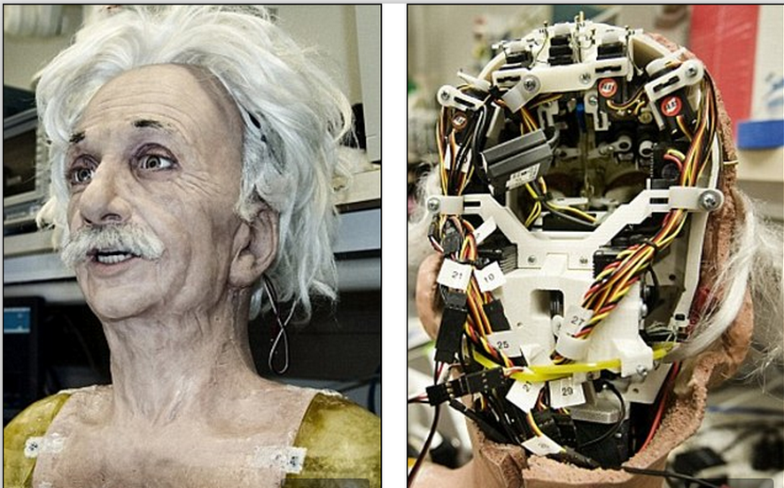 如图所示,这是爱因斯坦机器人,具有逼真的表情特征,它于2009年美国科技、娱乐和设计大会上初次登台亮相,是由美国加州大学研制的。